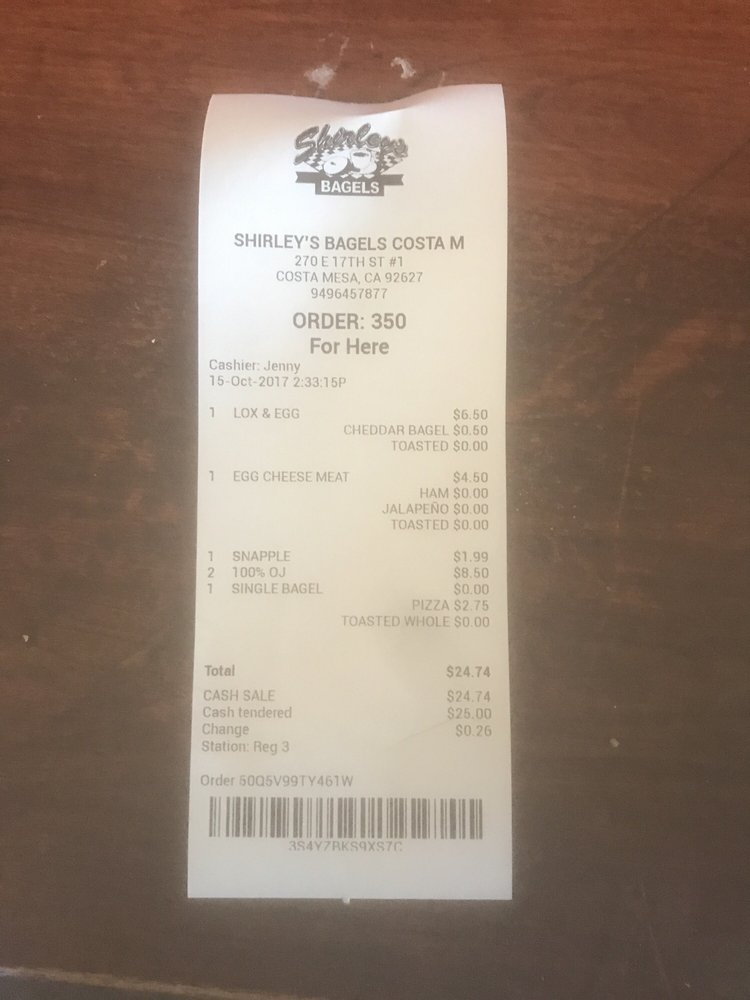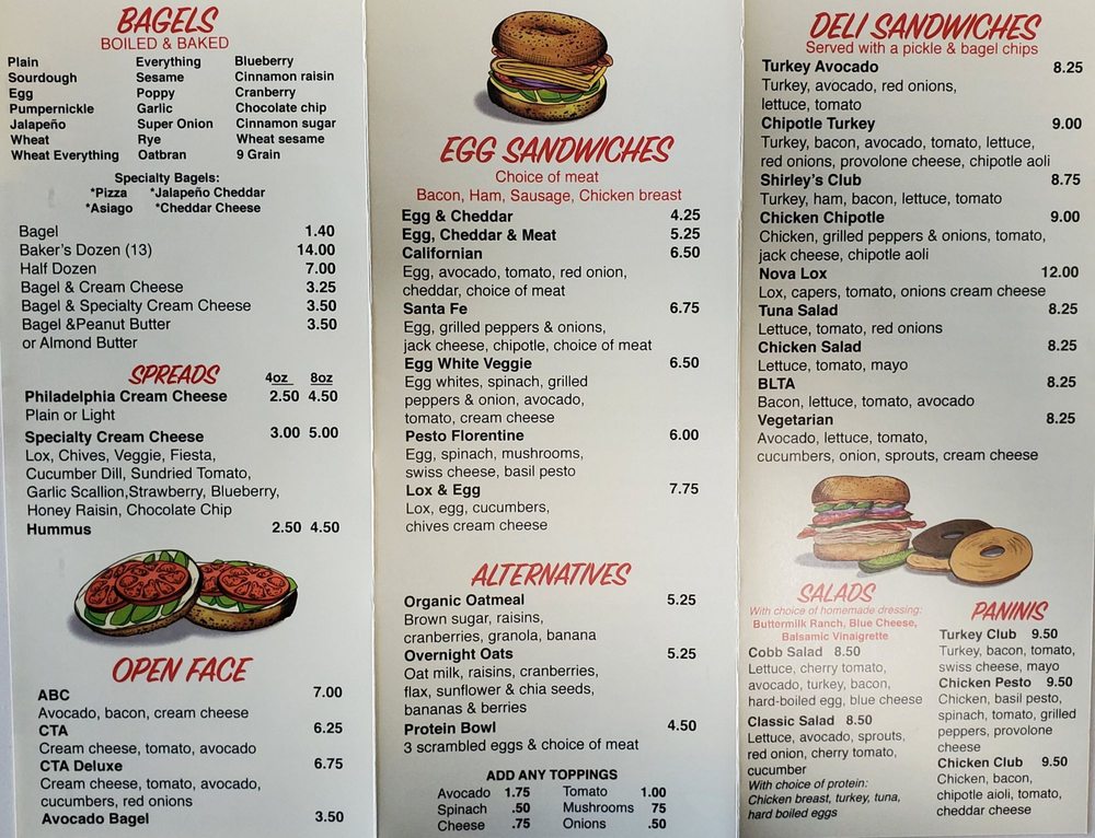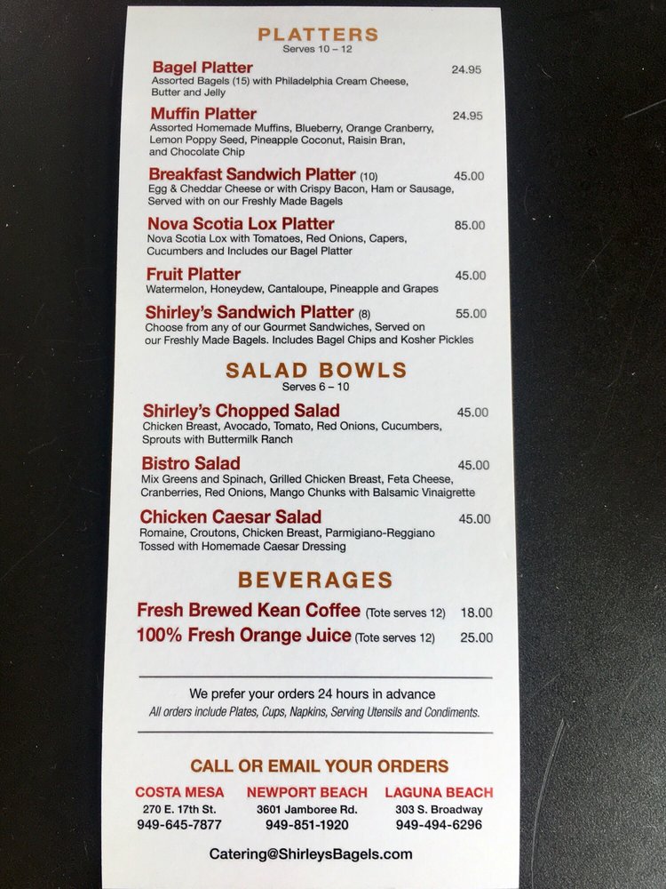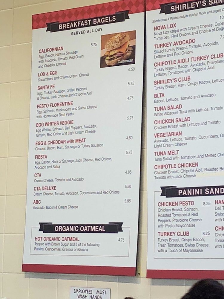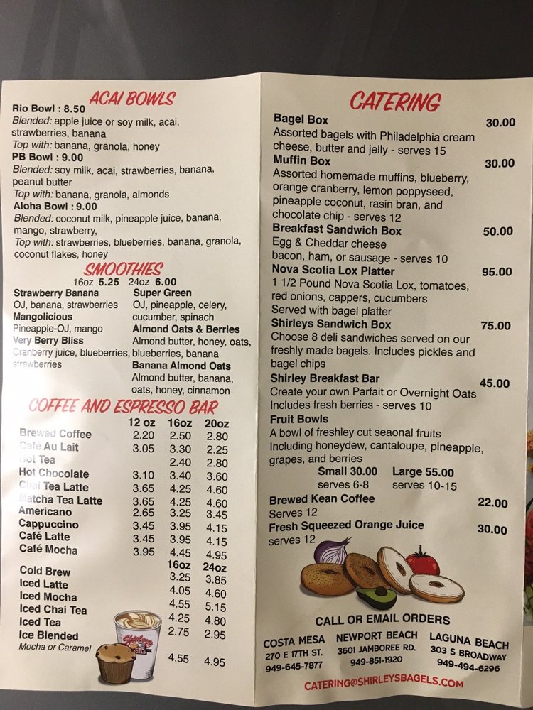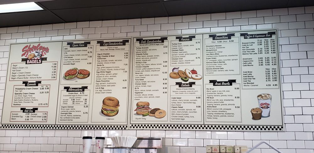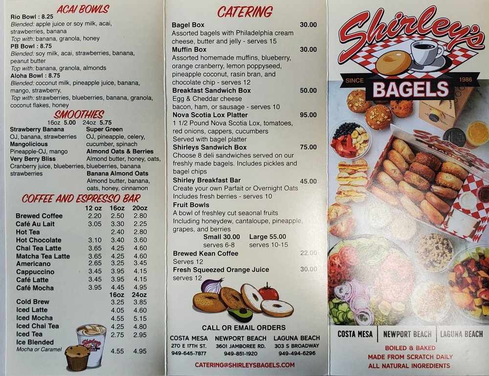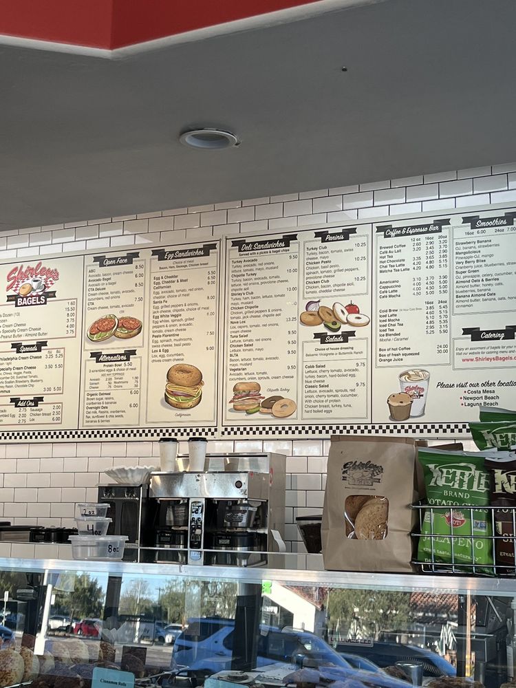Shirley's Bagels, located in Costa Mesa, CA, is the go-to spot for bagels, coffee, and tea. This neighborhood favorite offers a range of options, from classic bagel sandwiches to vegan choices, all served in plastic-free packaging. Customers rave about the generous portions of cream cheese, the perfectly chewy bagels, and the flavorful toppings like lox and jalapeños. The cozy dining area, quick service, and complimentary bagel crisps add to the overall experience. With a diverse menu that caters to all tastes, Shirley's Bagels is a must-visit for bagel enthusiasts looking for quality and taste in every bite.